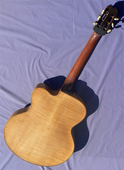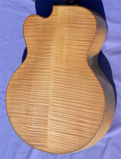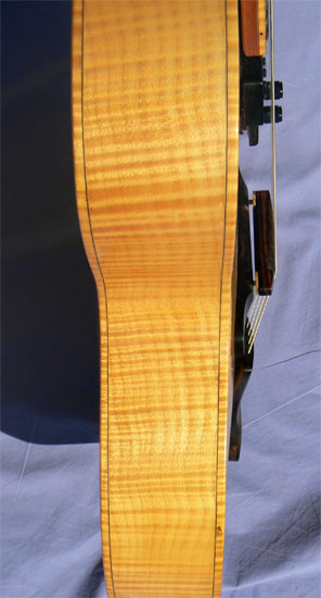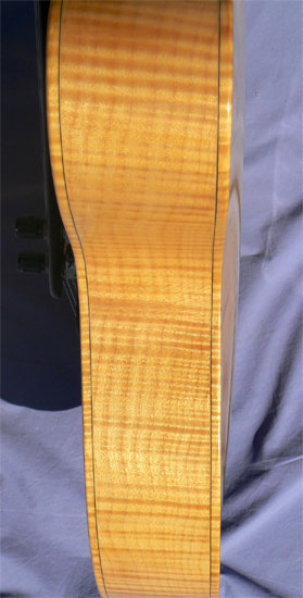 Materials: Solid bookmatched hand graduated Adirondack spruce soundboard; handcarved solid AAAA tiger flame maple back and sides; solid mahogany neck with purpleheart head and back facings; solid ebony fingerboard, with Earvana compensated nut.