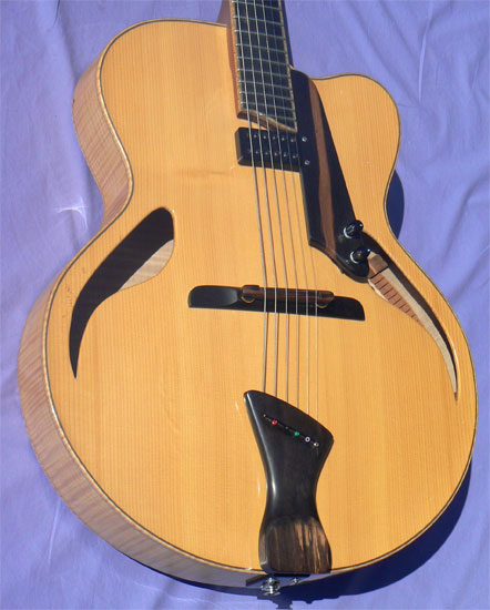 SN# 361001. Signed and dated by the maker: 9-30-01. Body size at lower bout: 18", Body Depth: 3" Scale length: 25 1/2" Nut: 1 3/4" Neck depth, 1st/10th frets: .84/.91