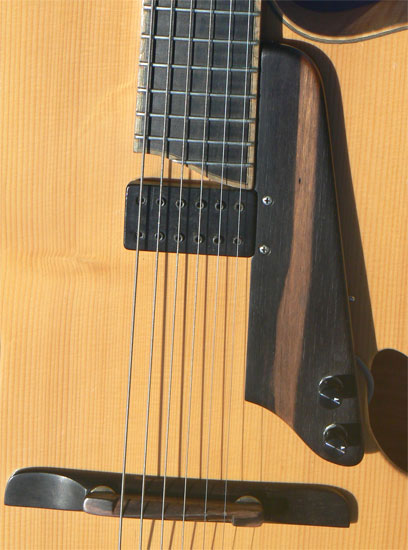 Hardware: Original Macassar ebony hardware includes contoured pickguard, tailpiece, and compensated adjustable bridge; gold 3-on-a-plate tuners; Armstrong floating PAF humbucking pickup with volume and tone controls, endpin jack.