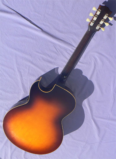 The fingerboard is the full 1 11/16" width, with the classic full 'C' neck profile that feels just right in the hand, with smooth low action over a fresh high precision setup. The top and back show fine slab cut figure in the arched maple, and the true nitro lacquer finish is given a light patina of age to complete the vintage appearance. With vintage style slim tall fretwork, the fingerboard is utterly effortless to play, and the tone is pure bop heaven, warmly enhanced by the solid rosewood bridge, a most welcome touch.