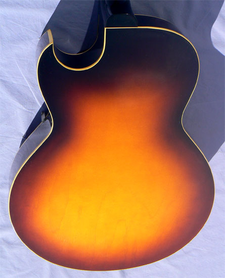 Serial #: A-07569, orange oval Memphis label. Body size at lower bout: 16". Scale length: 24 3/4" Nut Width: 1 11/16" Neck depth, 1st/10th frets: .87/1.05