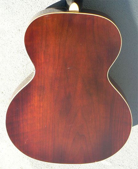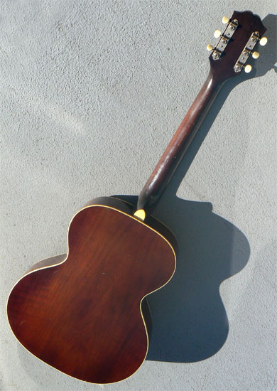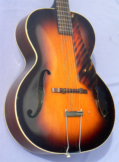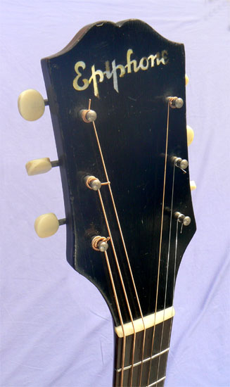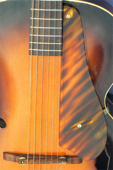 At a scant 4lb 10oz, the guitar is happily lightweight and well balanced, on the lap or the strap. The Brazilian rosewood fingerboard has smooth low action over polished recent fretwork, and the gentle light V neck glides easily across the palm. The guitar has the bark of a true 40's Epi, bright and forward with vibrant projection, and plenty of punch. A special plus, the slightly larger body adds enhanced bass response and sustain, compared with the smaller bodied model used by Rawlins .