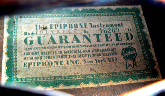 Notes: One of the original Epi archtop models, the Olympic was introduced in 1931, and remained in the catalog until 1949. Originally sporting a 13" mahogany body, the Olympic was upsized twice to it's final 15 1/2" body design. Unlike the Gibson archtops of comparable size, the Olympic and its other Epi cousins all had long scale necks and suspended fingerboards, to maximize their formidable projection and bark.