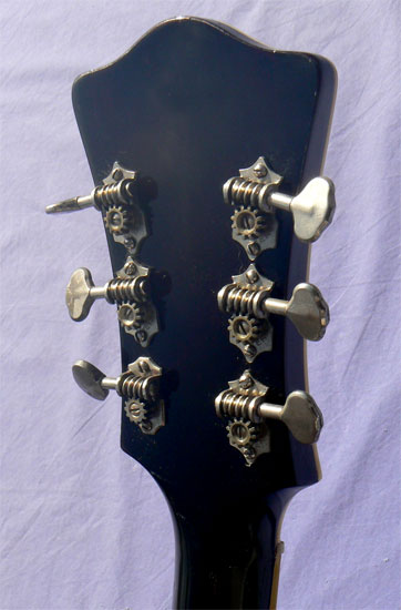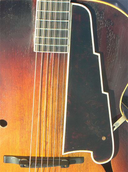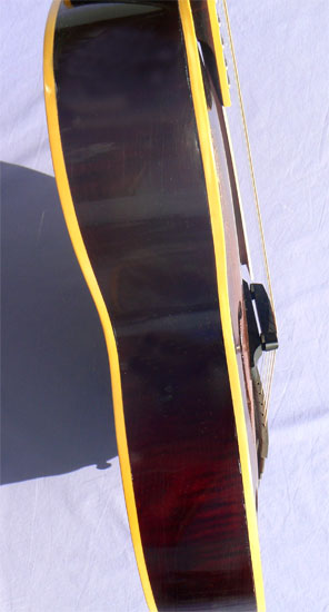 Some attractive curly maple is visible in the back, under a more recent deep walnut finish, which extends to the neck as well. The top retains its original dark sunburst finish, now protected with some light clear vintage style gloss lacquer. The older finish shows some pitting and weathering, mostly near the rims, but is otherwise free of pick, thumb, buckle or fingerboard wear. All binding is tight to the body, and both neck angle and bridge height are excellent, with ample room for adjustment up or down.