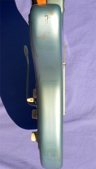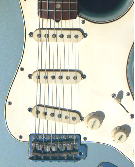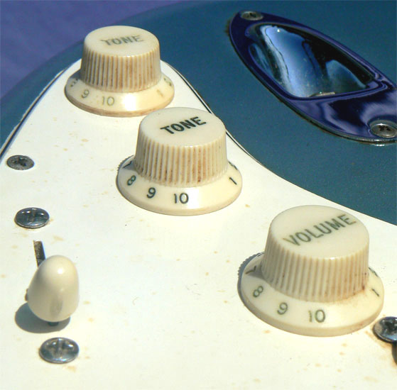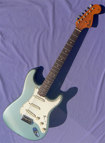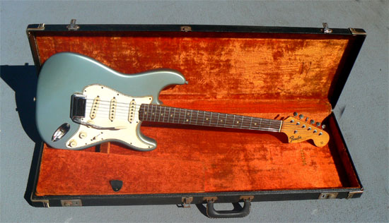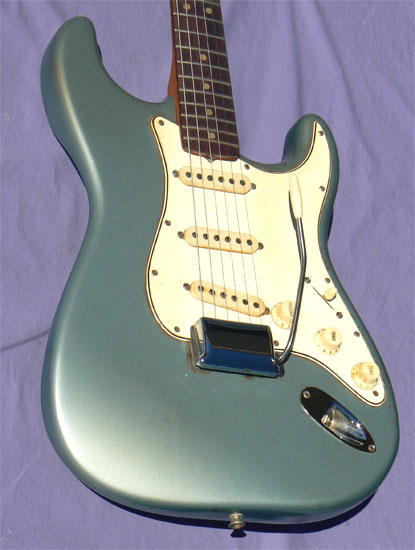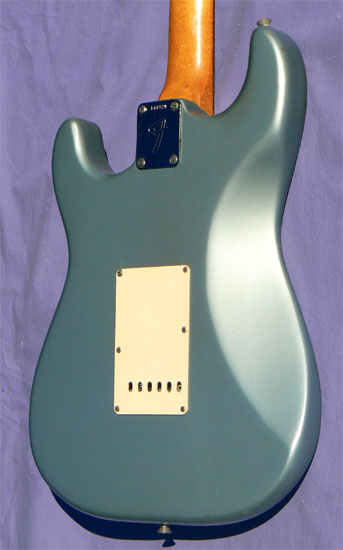 When its owner purchased this guitar brand new, he was looking for a bargain, and got one. At the time, it seemed that everyone wanted a sunburst Strat, so this guitar was marked down, owing to its unusual color. It was metallic. And blue. But not the more common Lake Placid Blue. The actual Lucite finish from the Fender color chart lists it as "Blue Ice Metallic' and it was offered only from 1965 to 1969, on a very limited number of instruments. (And on a Ford Fairlane of the era as well, if you were lucky.) Simply put, to behold its shimmering light azure hue is to time trip to that delicious American Graffiti era of drive-in movies, chocolate malts, and roller skating carhops.