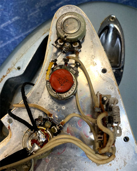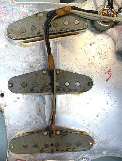 Not a single screw is missing, and every one is factory original. There is no pick wear, no buckle wear, no thumb wear, no fretboard wear. The original Fender 'jumbo' frets, introduced that year, are all but pristine. The staggered pole pickups date to June of 1966, and measure from 5.51 to 5.76K. The original Stackpole pots date from the Spring of that year as well, with original capacitor, switch, wiring harness, and solder joints intact. Virtually the only signs of age would be a tiny nick on the tremelo back plate, and a pair of small dimples in the finish on the treble edge, where this gleaming guitar rested in its case for all those decades.