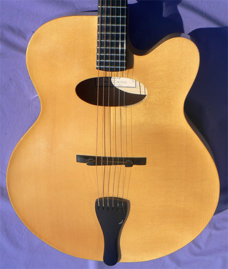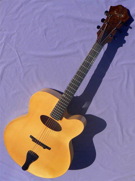 The overall design is a model of elegant simplicity, with a highly figured elm burl headstock facing, and a tailpiece graced with a tiny pearl songbird. For all its visual appeal, it's the voice where this unique instrument really sets itself apart. The oval soundhole, along with the ultralight X-braced soundboard, all combine to produce a tonal pallete of remarkable depth and sensitivity, with notably enhanced bass response and sustain, making it one of the rare archops equally suited for both finger and pick style play.
