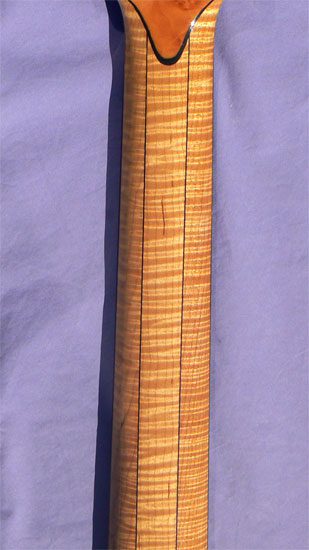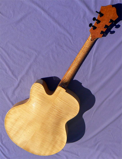 Materials: Solid bookmatched handcarved fine grain spruce soundboard; solid curly maple back, sides, and neck; solid ebony fingerboard; elm burl headstock facing with abalone headstock logo; ebony truss rod cover; polished graphite nut.