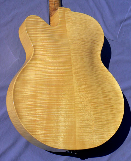 A product of Bob's Stroudsburg, PA workshop, this custom guitar is crafted of striking fiddleback maple, with a hand graduated soundboard of exceptionally fine grain, liberally interlaced with crossgrain silk. At scarcely over 5lb in total, the guitar is phenomenally light in weight for a full-depth, super jumbo instrument, and is notably well balanced on the lap or the strap.