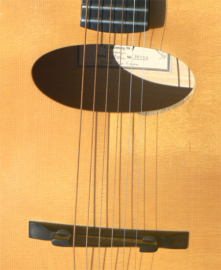 Setup: This instrument is strung with medium gauge bronze round wound strings. The guitar will accommodate lighter or heavier gauge strings, according to preference. String action is set at 4/64" to 5/64" at the 12th fret, with moderate relief for acoustic playing with medium strings. The action may be lowered or raised to your requirements with the adjustable bridge.