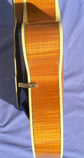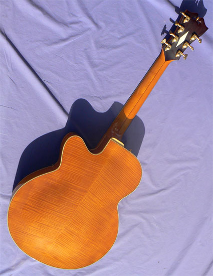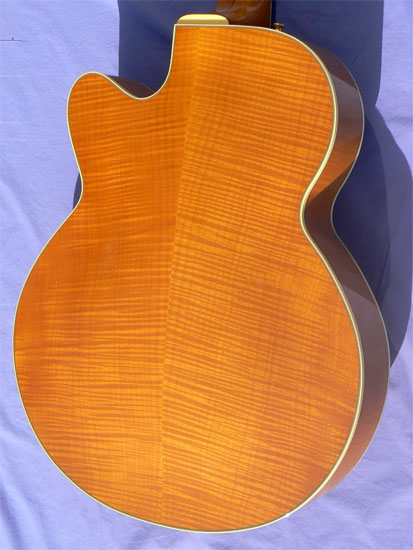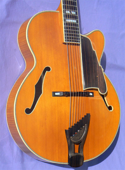 Materials: Hand carved X-braced German spruce top; solid maple back, sides, and neck; solid ebony fingerboard with pearl slashed-block inlays; seven ply body binding; triple bound f-holes.